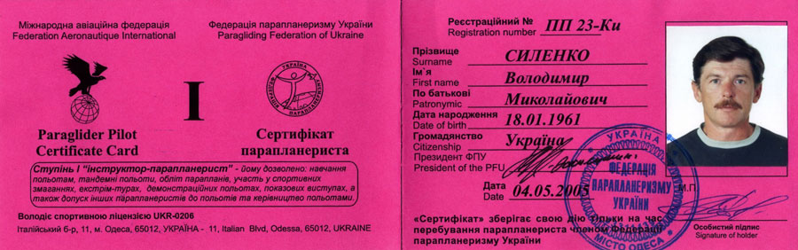 Всем и каждому члену ФПУ, срочно сдать мне, до 19 марта "Сертификат парапланериста"